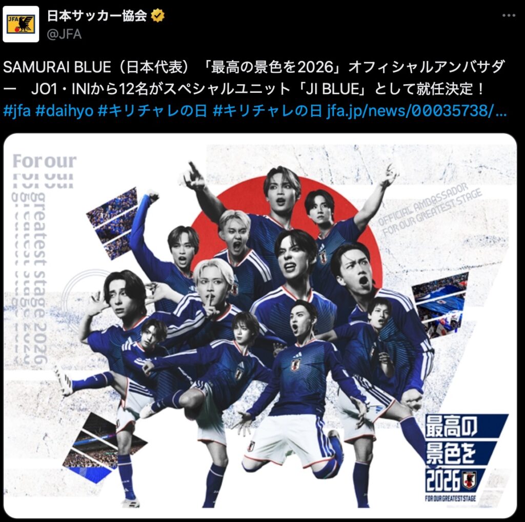 大炎上www日本サッカー協会「最高の景色を2026の公式アンバサは反日アイドルJO1・INIから〜」←SNS「韓国国旗やん….。」「WC負けろや日本代表」「年間15億も公金使うのやめろや」「前から韓国国旗やで」←「ふぁっ?!」