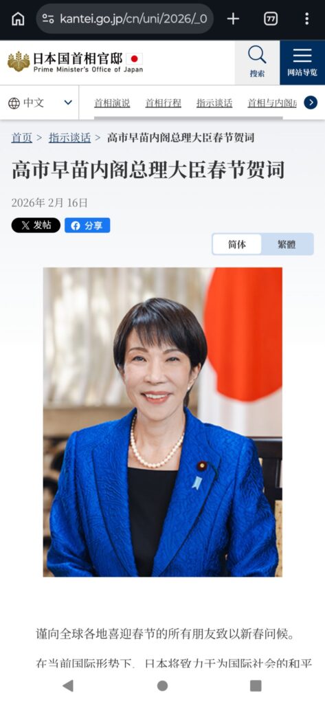 https://twitter.com/nhk_news/status/2023360979434979669?s=20 高市早苗総理が2026年2月16日に官邸HPで掲載した春節(旧正月)祝辞について、高市支持層(いわゆる「...