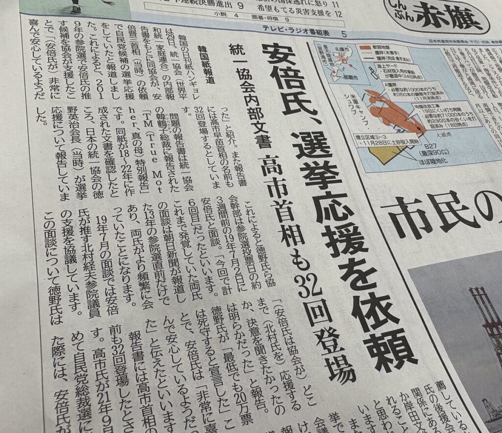 【旧統一教会「自民290人を支援」「山上徹也の記録削除」と報告か=韓国紙】 韓国のハンギョレ新聞は、日本の世界平和統一家庭連合(旧統一教会)の元会長が過去に、本部の韓鶴子(ハン・ハクチャ)総裁に行った「トゥルー・マザー特別報告」の内容について伝えた。
