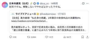 酒類を含む食料品の消費税率を恒久的にゼロにすると公約に明記。「減税による経済活性化」を柱に、外国人政策厳格化や再エネ賦課金廃止も併せて訴求。 - その他の政党(主に野党)