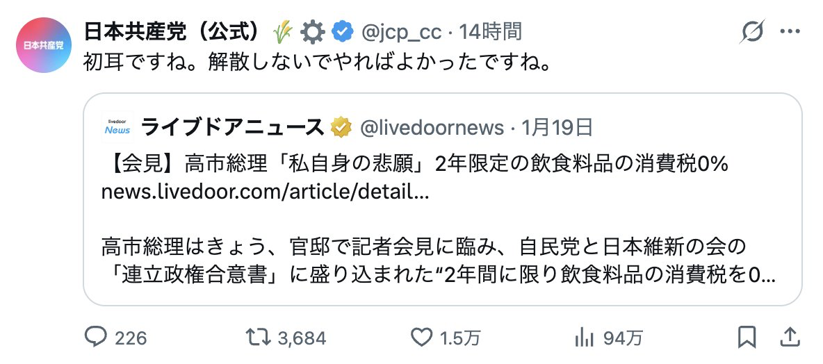 食料品だけでも消費税減税してくれることはありがたいし、絶対やるべきだし、是非ともやってほしいから恒久的にやってくれる中道に票は集まると思うし俺も中道に入れるのだが。