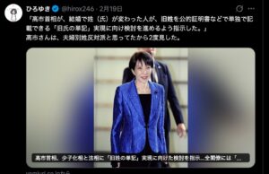 また、@takenoma氏(竹田恒泰氏)は、「公的証明書に旧姓を単記する以上、事実上の選択的夫婦別姓となる可能性がある」と警告。政府がこれまで進めてきた通称使用拡大で十分だと主張し、政策の詳細不明を問題視しています。 これらの声は、戸籍が家族の絆を象徴する日本独自の制度を、別姓推進で崩壊させる試みだと批判しています。