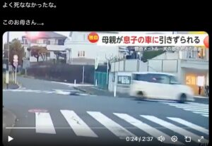 横浜市金沢区で起きた事故の映像で、犬のリードを持った母親が息子の運転する車に数百メートル引きずられてしまったというものです。